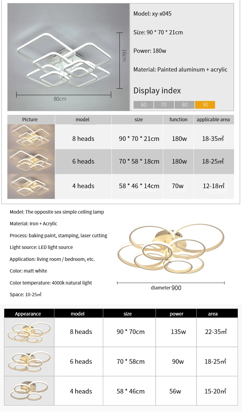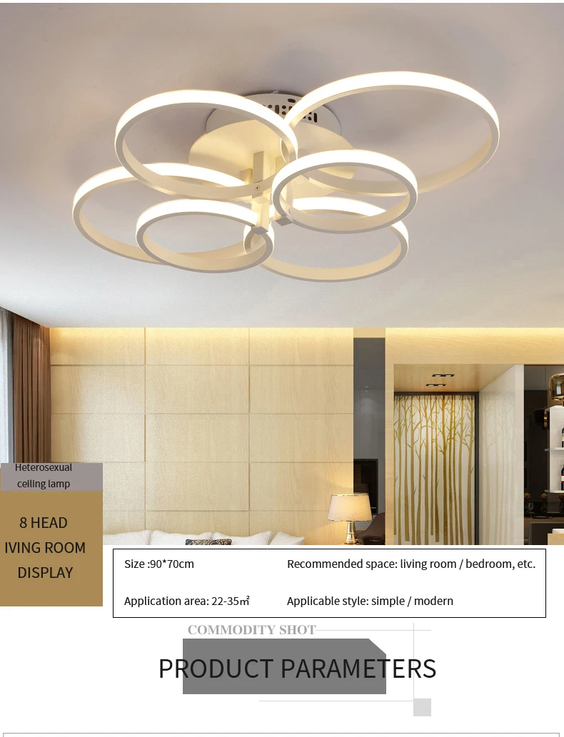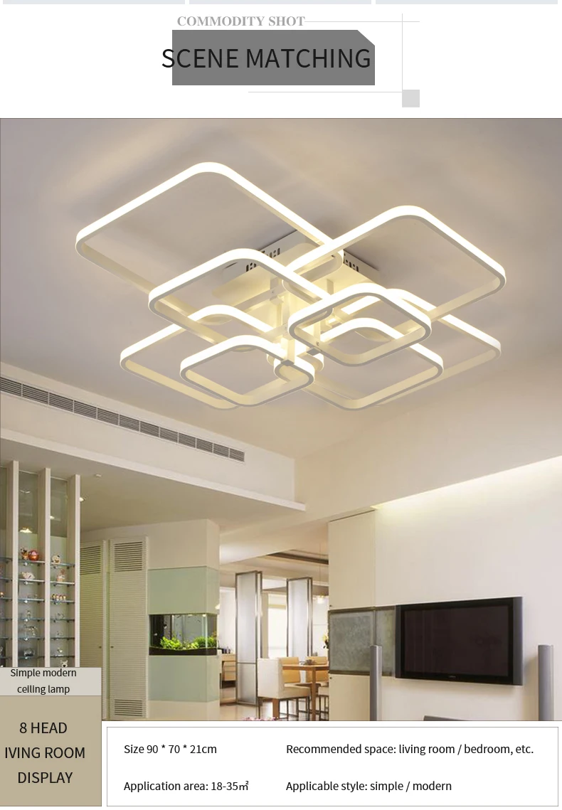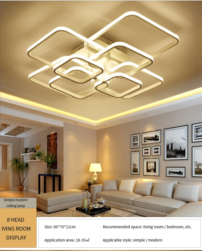 Specifications Light source: LED Color Temperature: warm white/cool white/Brightness dimmable 1. Cool White: No remote. 2. Warm White: No remote. 3. Brightness Dimmale: It have Cool white,natural white, Warm White,It can adjust the brightness and color,adjustment is brighter-darker and the ability to switch from cold light to Warm, have remote(not contain battery) Light Source Life Span: 50000 hrs Voltage:AC85-260V (Please note the voltage when ordering or contact us!) Material: Aluminum + Acrylic Size: 4 heads 58*46*12 cm 6 heads 70*58*15 cm 8 heads 90*70*18 cm Color:White Application: Living room,Bedroom,Dining room,Kitchen,Study room,Bar Any Problems, Please contact customer services,We will reply you in the first time. Notes: 1. Manual measuring, please allow 1 ~ 3mm error,thank you for your understanding. 2. Due to the difference between different monitors, the picture may not reflect the actual color of the item. We guarantee the type is the same. 3.Please kindly confirm the SIZE and the Voltage of the lamp before you buying.